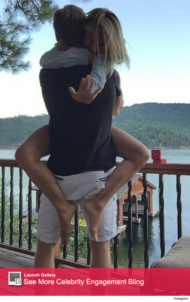 "We are overwhelmed with joy and excitement to share with you our recent engagement! #fiancé #love," she captioned the pic, where she's seen gazing at her new ring as she wraps her legs around her hunky hubby-to-be.