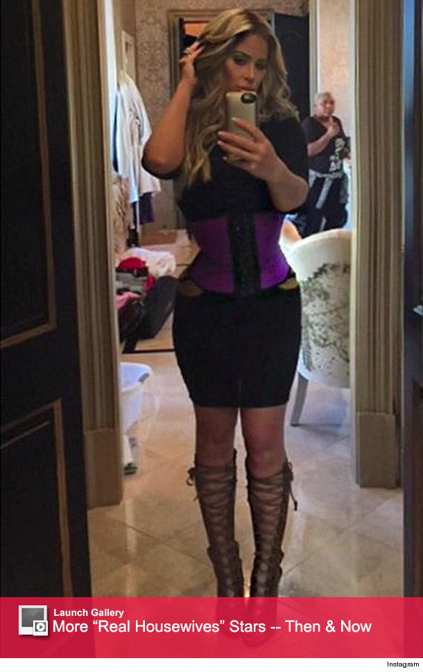 In the photo,the mom-of-six snaps a mirror pic while wearing a tight black mini, a purple corset and lace up gladiator boots, while flaunting full hair and makeup.