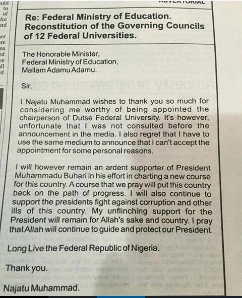 In a newspaper advertorial which shocked many earlier today, Hajiya Najatu Muhammad has become the first Nigerian to reject an appointment from President Muhammadu Buhari.