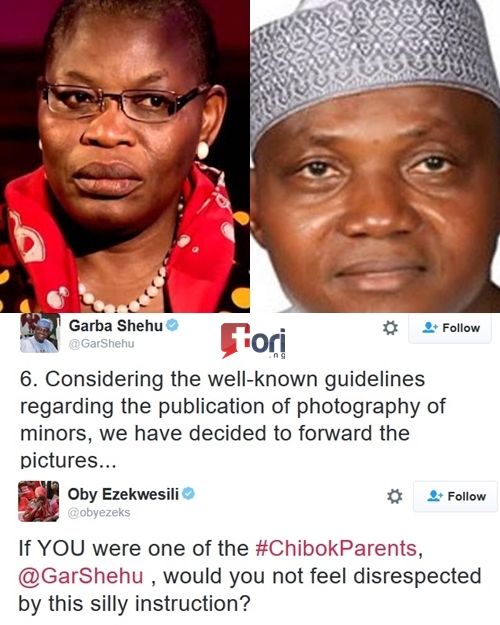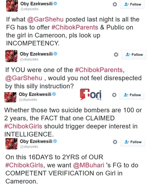 The convener of the Bring Back Our Girl (BBOG) Group, Oby Ezekweili, few hours ago, took to her Twitter to call out President Buhari's Senior Special Assistant on Media and Publicity, Shehu Garba, over the statement he released on the female suicide bomber arrested in Cameroon who claims she is one of the missing Chibok Girls.