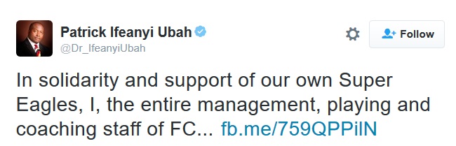 "In solidarity and support of our own Super Eagles, I, the entire management, playing and coaching staff of FC Ifeanyi Ubah flew to Kaduna this morning aboard the team's private aircraft and an Air Peace flight to cheer the Super Eagles as we set out to demolish The Pharaohs of Egypt today.