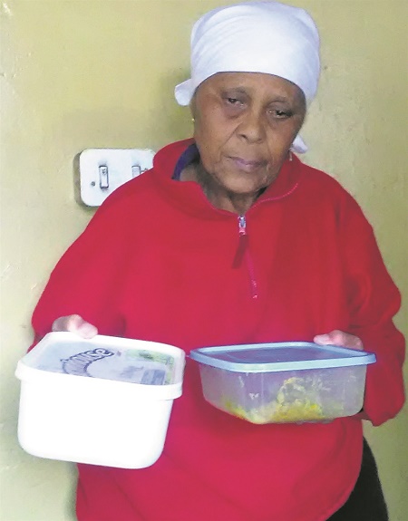 Gogo Mabaruti Maake shows the container of food that the family ate